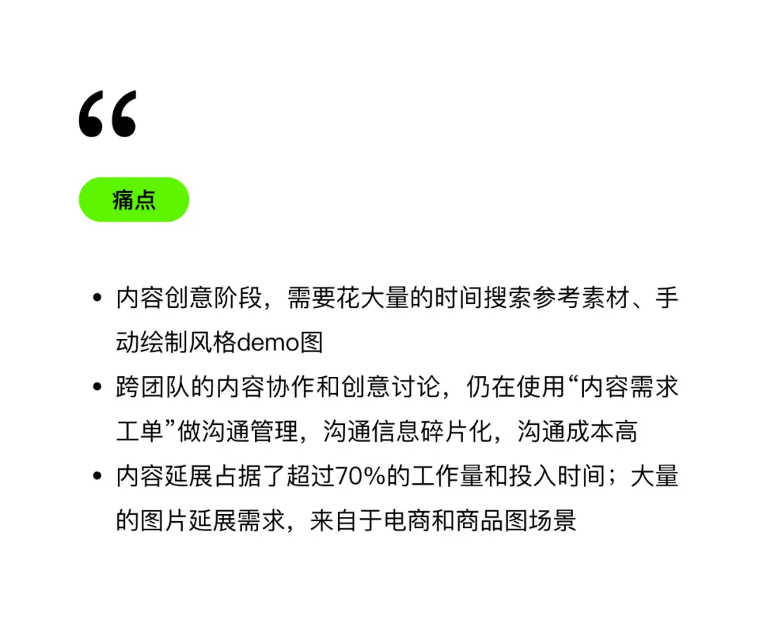 - 最花时间的地方在:1) 设计参考阶段,需要寻找大量的参考图,平均需要0.5 - 1天;2) 与业务部门沟通内容创意,需要用具象的视觉产出来呈现(传统的手动绘制创意草图+与业务部门沟通,往往需要花费大量的时间)。