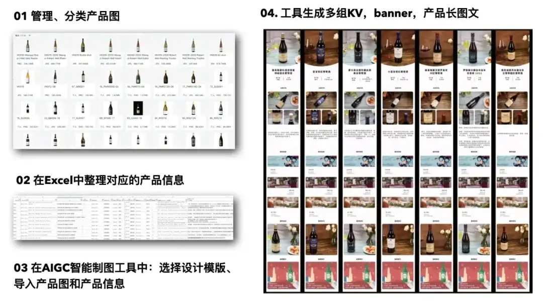解决方案:1. 商品主图里替换元素和信息的延展提效首先要解决产品信息与产品内容的关联:DAM作为内容管理的中台工具,无论是通过Excel数据导入,还是和PIM系统集成,都可以实现产品信息与内容素材的有效关联。商品主图在设计完成并被上传到DAM系统后,借助于“AIGC智能制图”功能,设计师们可以先在DAM的品牌素材库中调取产品主图模版,通过对接的PIM系统 或 预设的Excel产品模版导入商品信息,系统即可完成商品图的智能一键生成。每张商品图的主题、板式规格保持一致,产品信息、产品数据可灵活替换。从设计美学的角度看,这个技术在“罐装类商品、多赠品”的商品长图、促销海报类的内容上,产出效果较好,所以很适合饮料、酒水、美妆、个护类产品图的延展提效。
