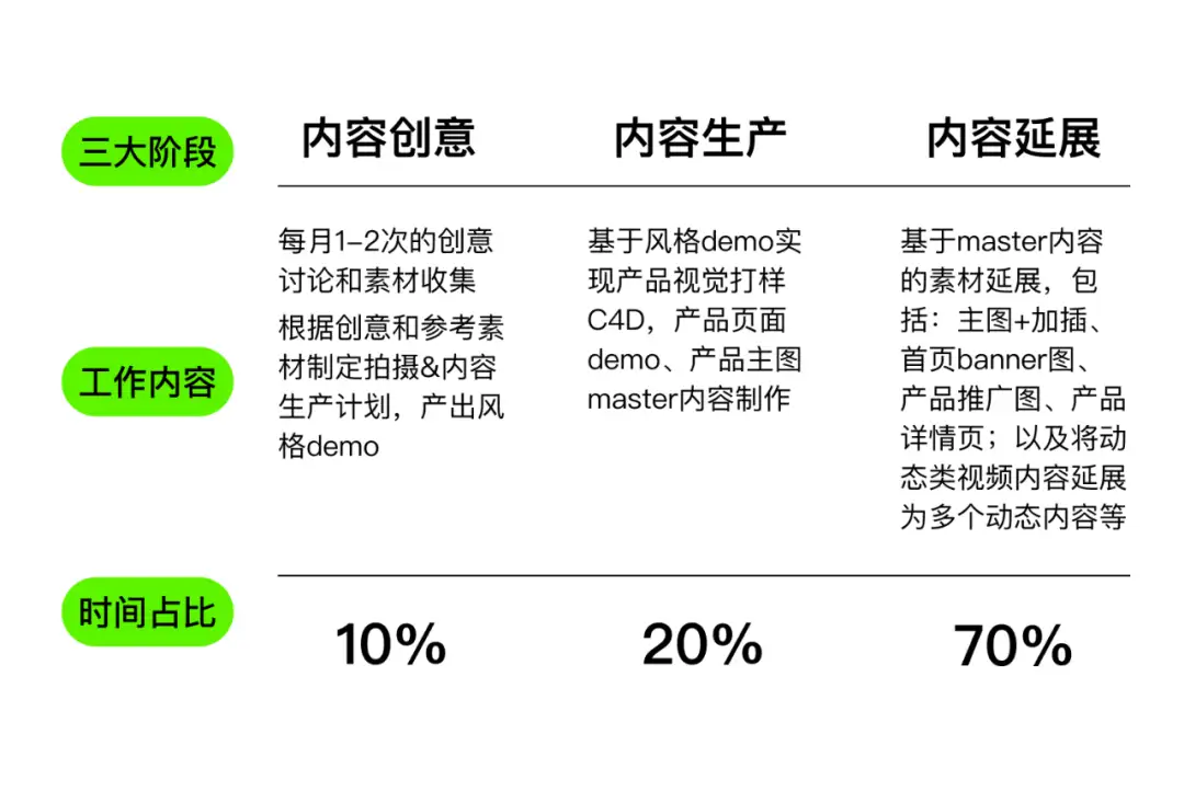从品牌内容设计师的视角,生产的3个主要环节及对应的时间占比,大致如下: