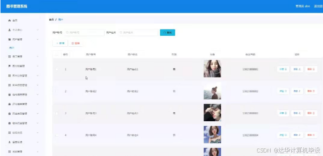 用户管理,在用户管理页面可以对用户账号,用户姓名,性别,头像,电话号码等内容进行详情,修改和删除等操作,如图5-8所示。
