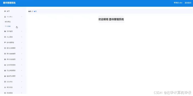 用户登录进入图书管理系统可以对首页,个人中心,借书信息管理,还书信息管理,缴纳罚金管理等功能进行相应操作,如图5-14所示。