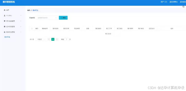 缴纳罚金管理,在缴纳罚金管理页面可以对缴纳编号,图书名称,图书分类,罚金类型,金额,登记时间,员工工号,员工姓名,用户账号,用户姓名,是否支付等内容进行操作;如图5-17所示。