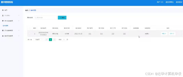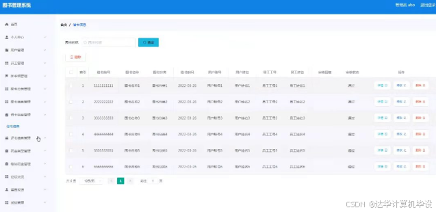 借书信息管理,在借书信息管理页面可以对借书编号,图书名称,图书分类,借书时间,用户账号,用户姓名,员工工号,员工姓名,审核回复,审核状态等内容进行详情,修改和删除等操作,如图5-11所示。