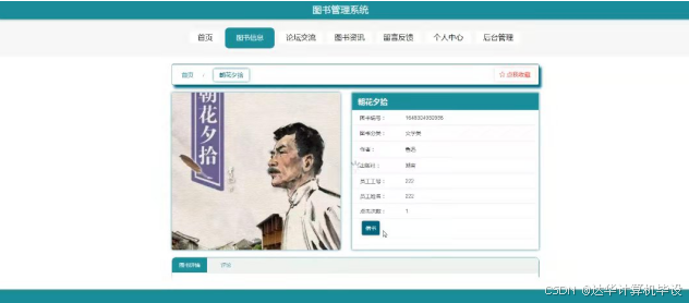 图书信息,在图书信息页面可以查看图书编号,图书分类,作者,出版社,员工工号,员工姓名,点击次数等详细内容,并进行收藏操作,如图5-2所示。