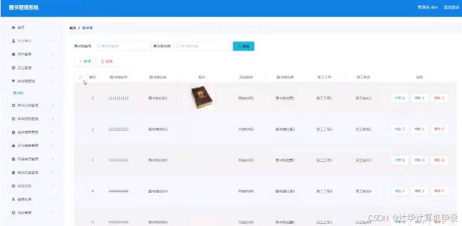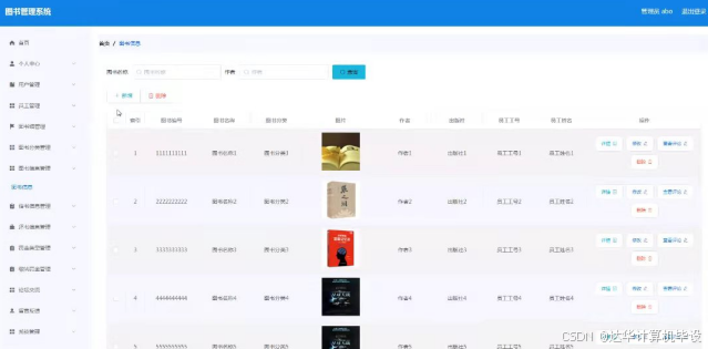 图书信息管理,在图书信息管理页面可以对图书编号,图书名称,图书分类,图片,作者,出版社,员工工号,员工姓名等内容进行详情,修改,查看评论和删除等操作,如图5-10所示。