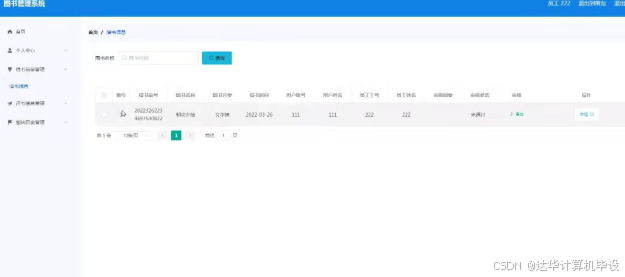 借书信息管理,在借书信息管理页面可以对借书编号,图书名称,图书分类,借书时间,用户账号,用户姓名,员工工号,员工姓名,审核回复,审核状态,审核等内容进行详情操作,如图5-19所示。