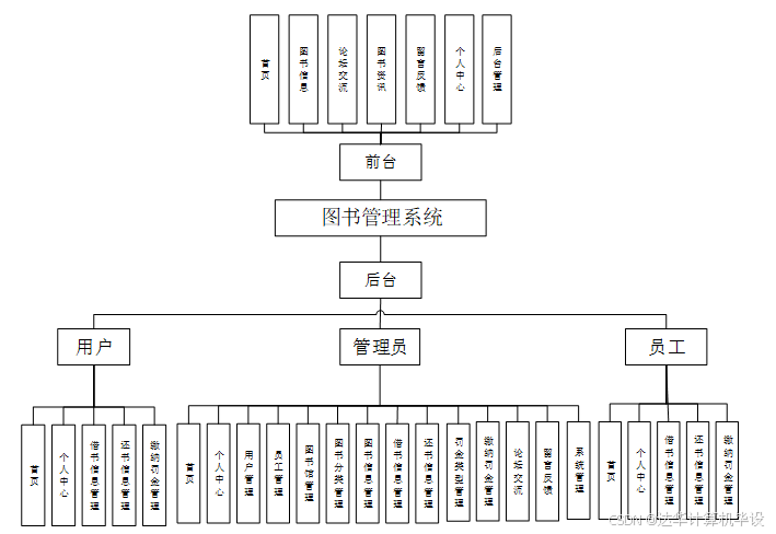 本图书管理系统提供管理员,用户和员工三个用户角色,主要包括首页,个人中心,用户管理,员工管理,图书管理,图书分类管理,图书信息管理,借书信息管理,还书信息管理,罚金类型管理,缴纳罚金管理,论坛交流,留言反馈,系统管理等功能。