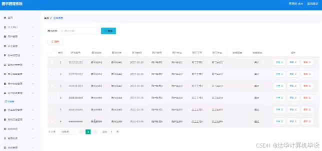 借书信息管理,在借书信息管理页面可以对借书编号,图书名称,图书分类,借书时间,用户账号,用户姓名,员工工号,员工姓名,审核回复,审核状态等内容进行详情和还书等操作,如图5-15所示。