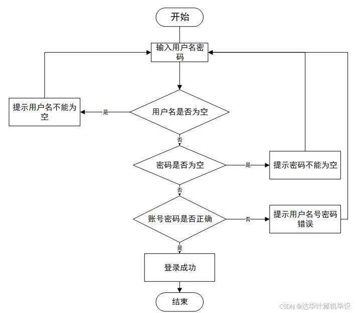 运行流程主要为输入用户名密码,并且不能为空,若为空则提示不能为空,用户名和密码全部输对即可登入成功,主要流程如图3-2。