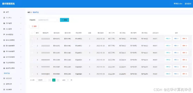 缴纳罚金管理,在缴纳罚金管理页面可以对缴纳编号,图书名称,图书分类,罚金类型,金额,登记时间,员工工号,员工姓名,用户账号,用户姓名,是否支付等内容进行详情,修改和删除操作;如图5-13所示。