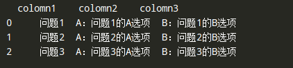 'colomn3': ['B:问题1的B选项', 'B:问题2的B选项', 'B:问题3的B选项']}