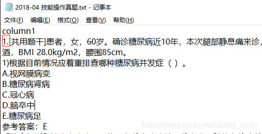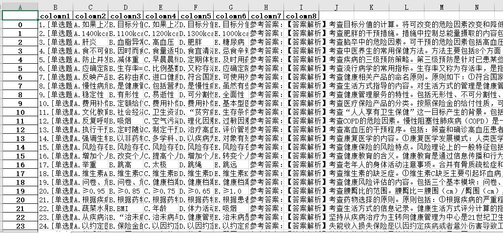 我最终需要的excel文档结构是这样的:每道题独立占1行,每1列是这道题的一项内容,大概就是问题、选项A、选项B等等。