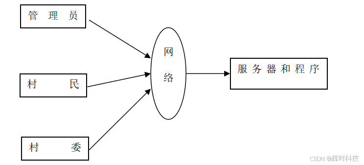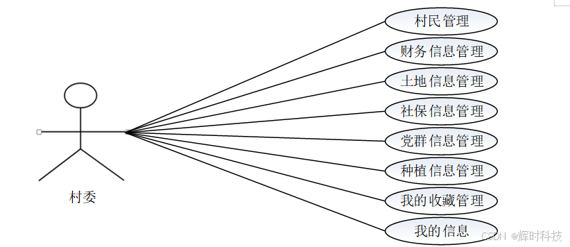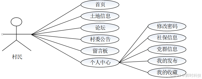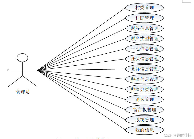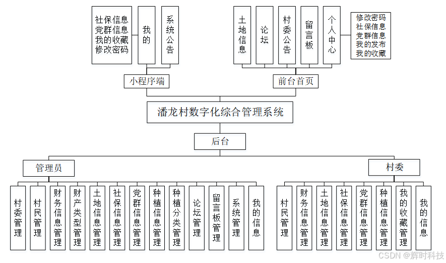 系统整体模块设计:系统分为管理员、村民和村委三大角色,系统管理员有最大的权限,总体功能展示如图4-3所示。
