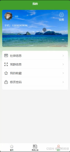 登录成功后,点击“我的”进入我的页面,在我的页面可以对社保信息、党群信息、我的收藏、修改密码等进行详细操作。如图5-7所示