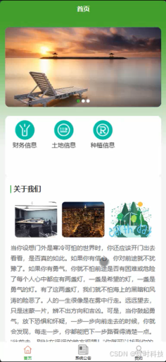 系统首页是用户注册登录后进入的第一个界面,可通过小程序端首页的最下面的那一行导航栏进入到相应的网页进行操作;系统首页界面如图5-6所示。