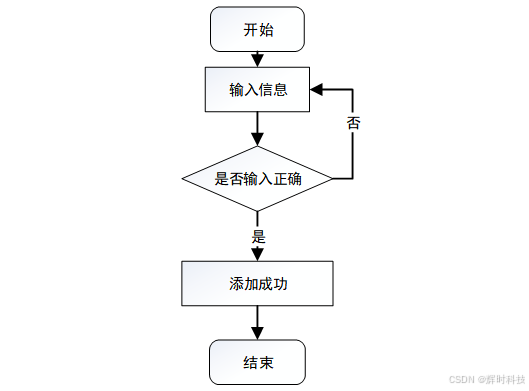 然后是添加信息的页面。进入该页面后,页面会出现一个提示框,示意操作者可以进行信息的添加,从而进行下一步的操作。用户输入想要添加的信息后提交,系统会对输入的内容进行检测。如果检测后输入的信息正确,则会出现“添加成功”的提示框,从而可以进行下一步操作;如果系统检测后检测到想要添加的信息不符合规范要求,则会提示报错,需要进行修改后重新添加。添加信息流程图如图3-5所示: