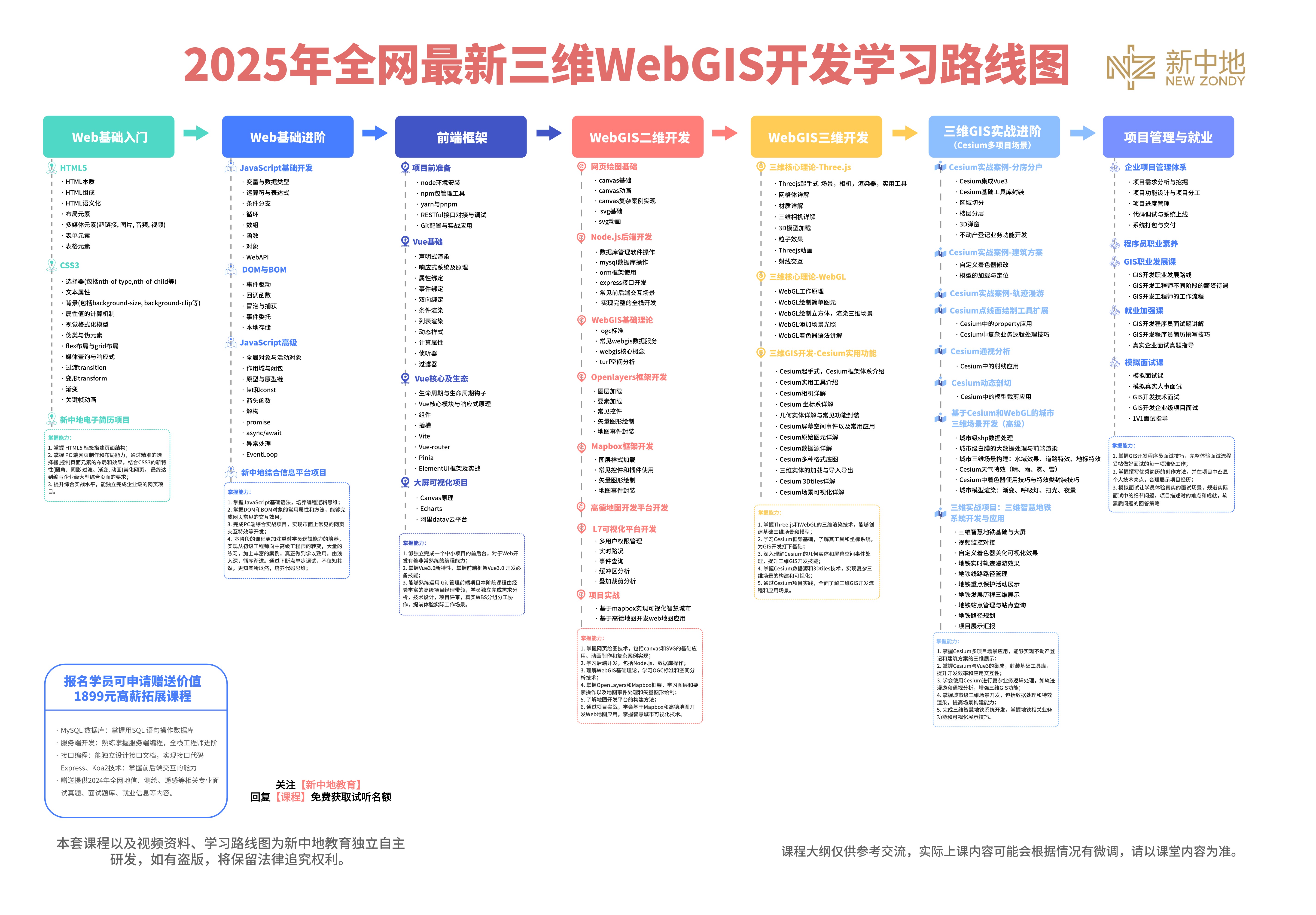 今天我们一起来看下,步入25年的GIS开发系统学习路线?跟随新中地的GIS开发学习路线,模拟真实项目开发流程,系统了解前端GIS开发、三维GIS开发等相关工作。