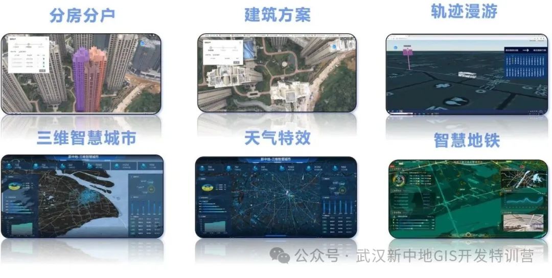 城市级shp数据处理、城市级白膜的大数据处理与前端渲染、城市三维场景构建(水域效果、道路特效、地标特效)、Cesium天气特效(晴、雨、雾、雪)、Cesium中着色器使用技巧与特效类封装技巧、城市模型渲染:渐变、呼吸灯、扫光、夜景
