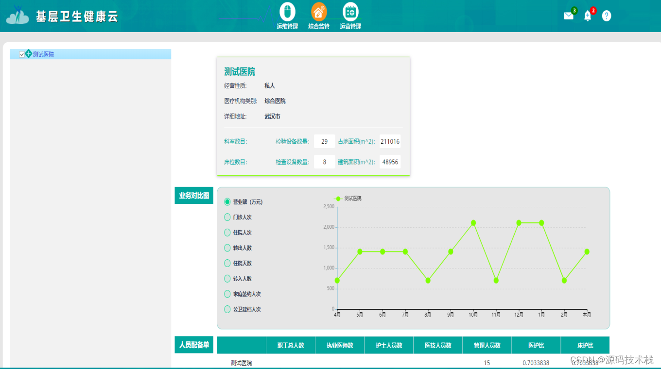 统计监管的医院机构的综合信息,包括医院业务量、人员配备量、支付分类占比等。