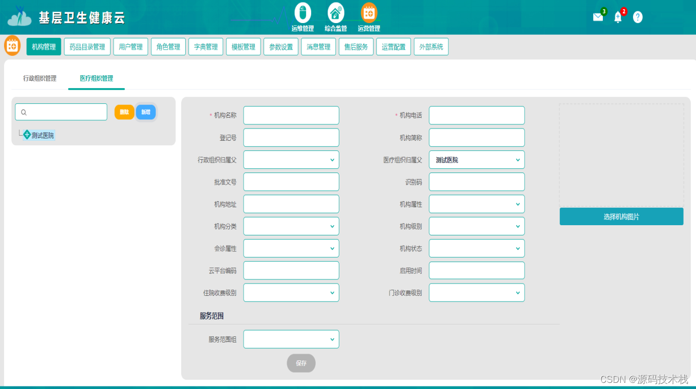 系统运营包括二级菜单:机构管理、药品目录管理、用户管理、角色管理、字典管理、模板管理、