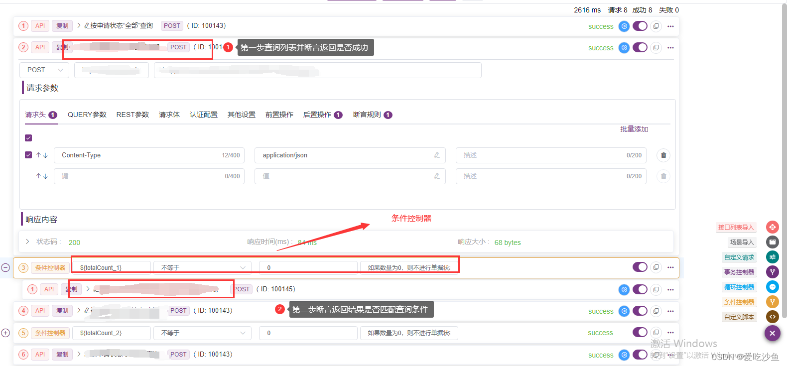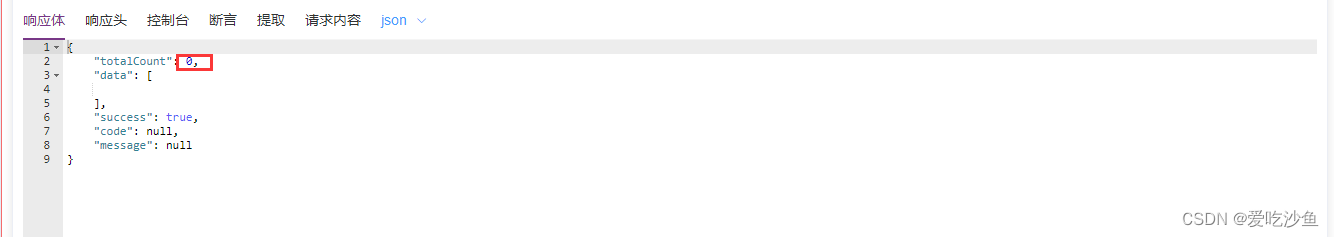 运用条件控制器,将其进行两次断言。第一次断言:校验是否成功,并提取total值。如上图success字段是否为true。第二次断言:返回数据是否匹配查询条件,其中第二次断言加入条件控制器。