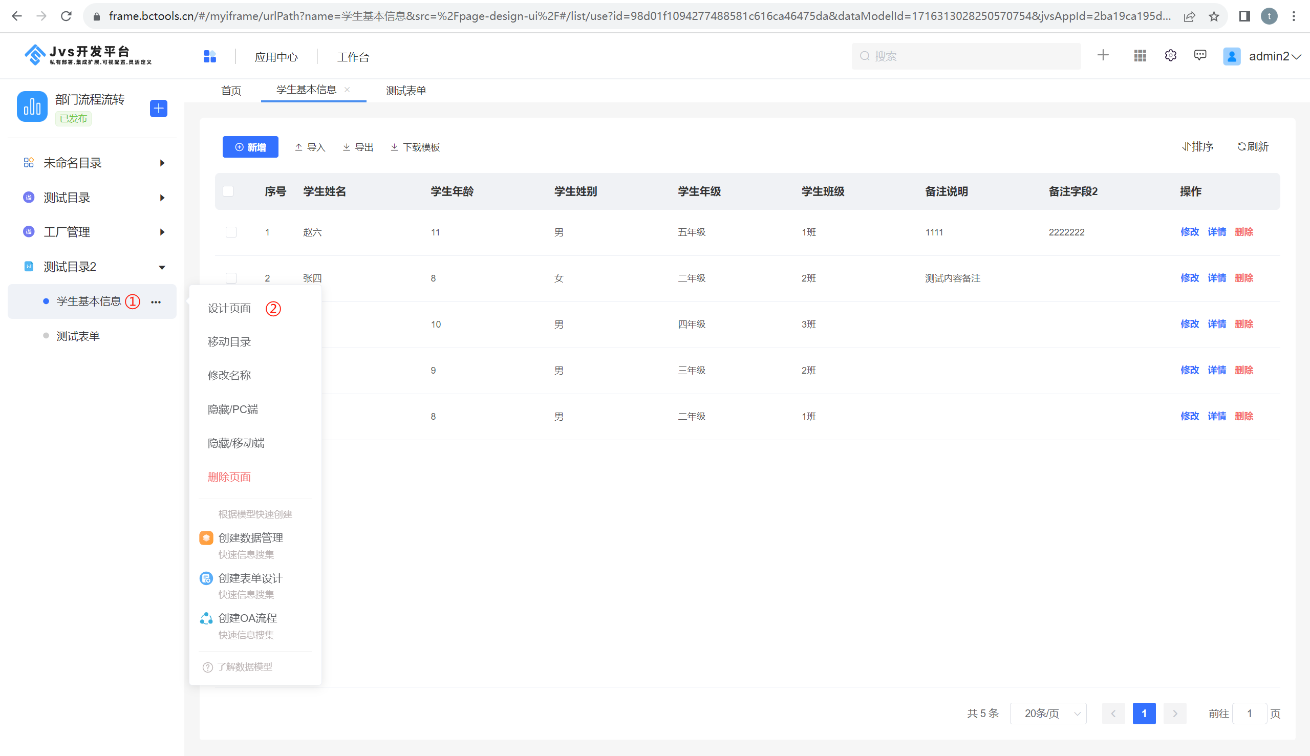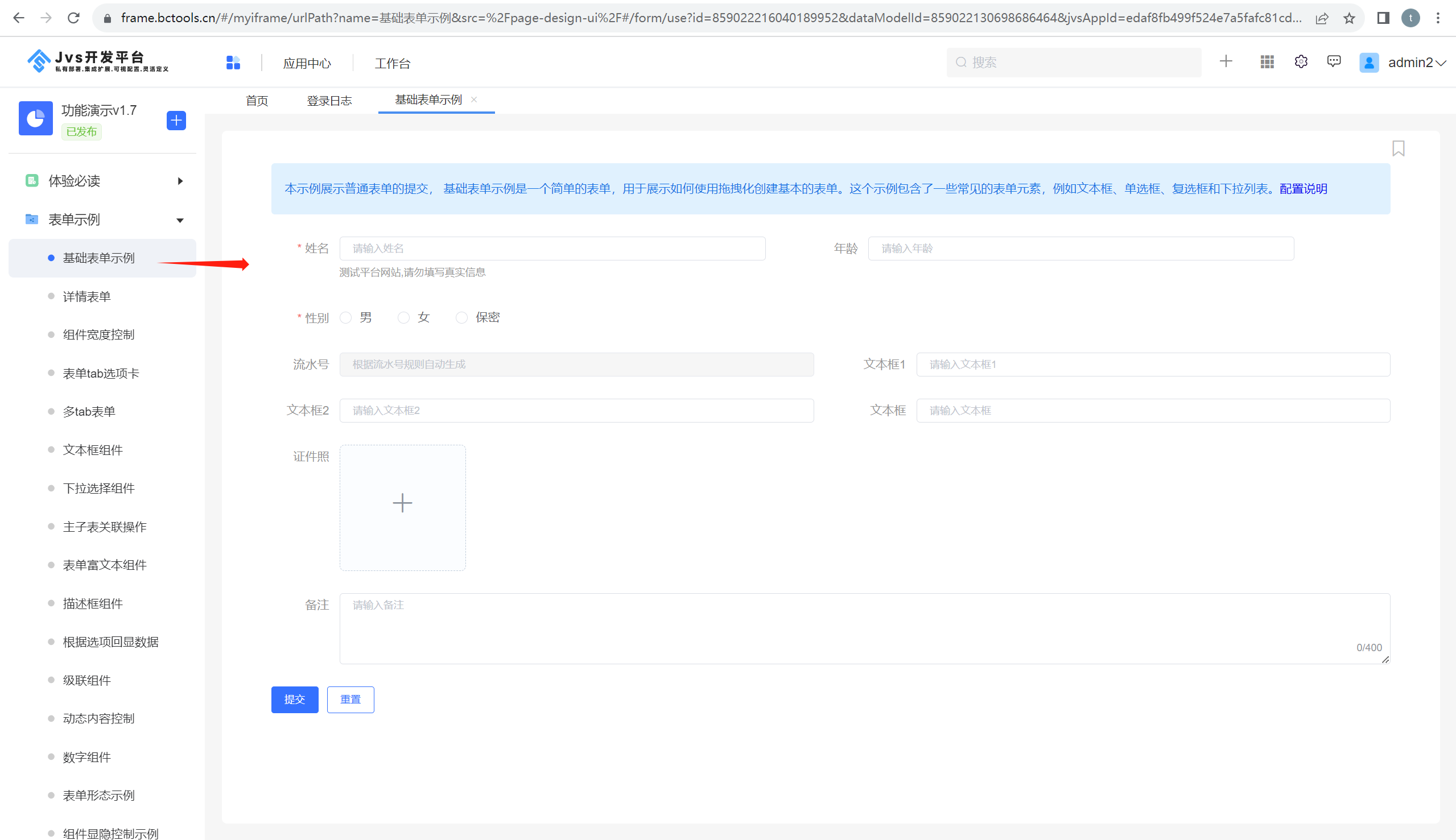 注:上述两种方式创建的独立表单差异点是:是否带有模型,通过目录创建表单是没有携带数据模型的,通过列表页创建表单,是复用列表页对应的模型创建