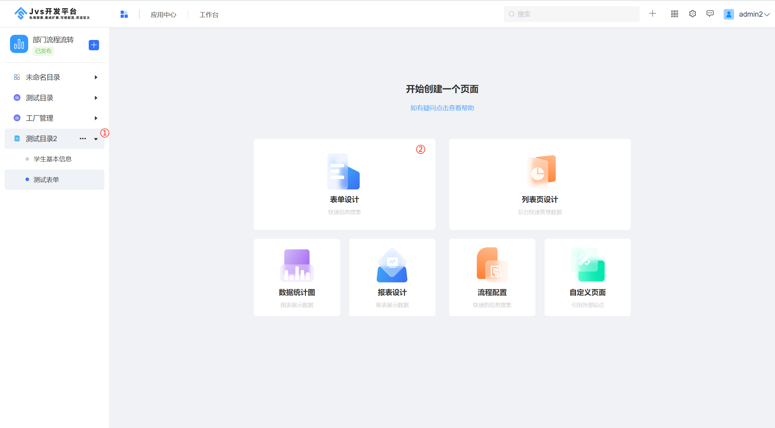 如下图所示,具备应用配置权限的用户,点击菜单目录,在右侧会出现新增页面选项,点击创建表单: