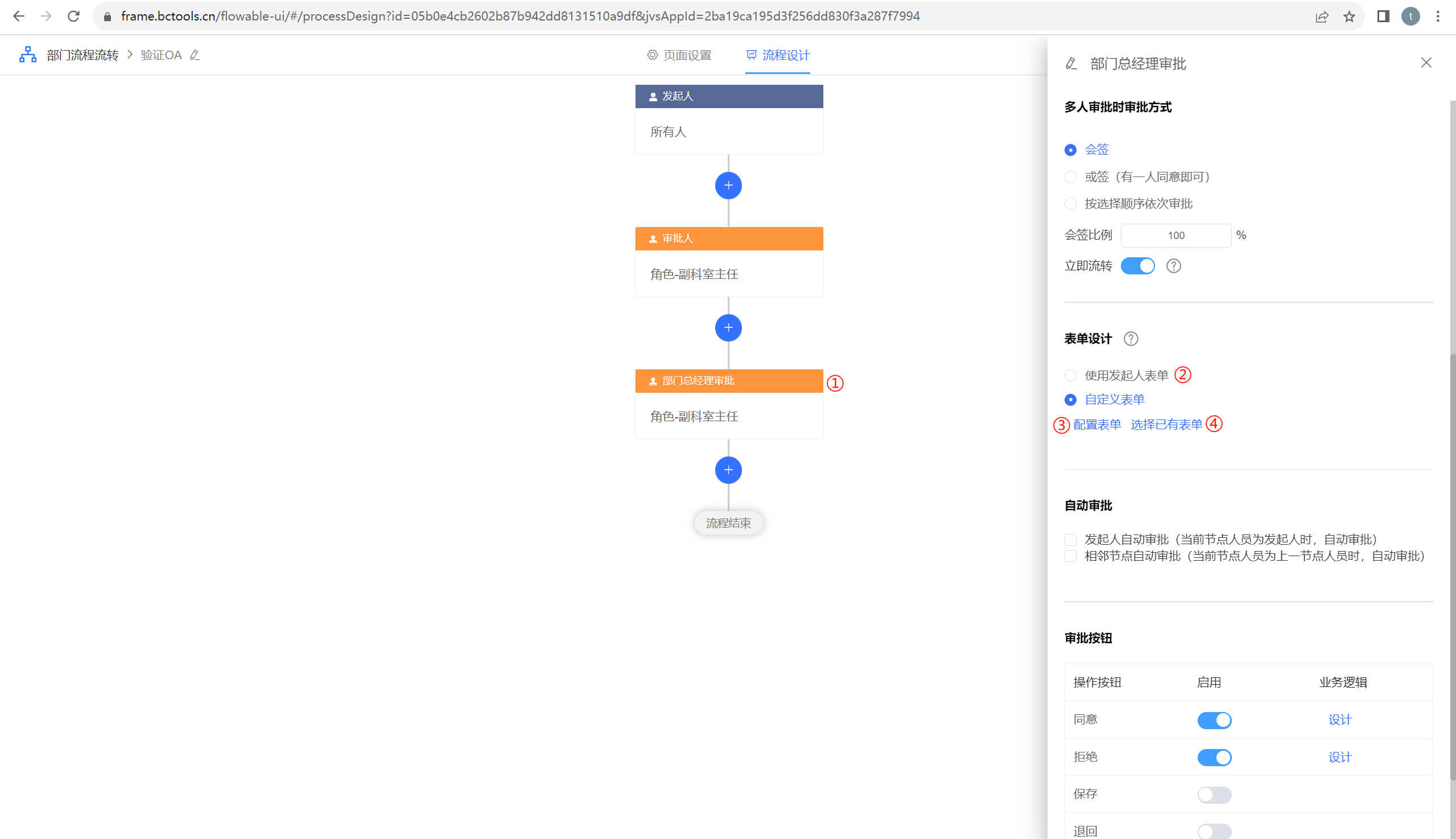 ①:点击环节模块,系统弹出右侧环节配置内容,其中包含配置人员、配置表单、配置审批模式、配置相应审批按钮等