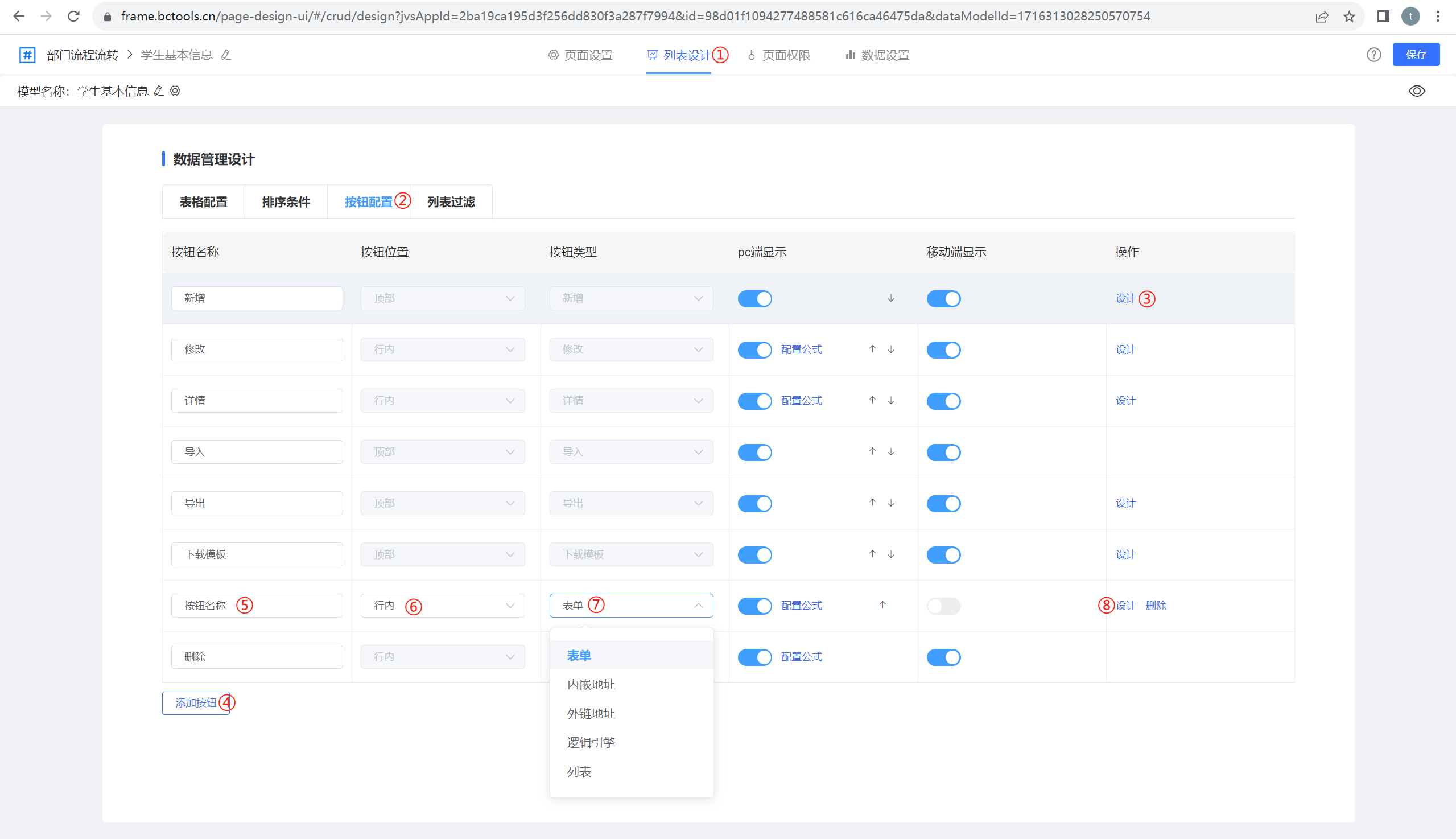进入列表页设计器-按钮配置界面如下图所示: