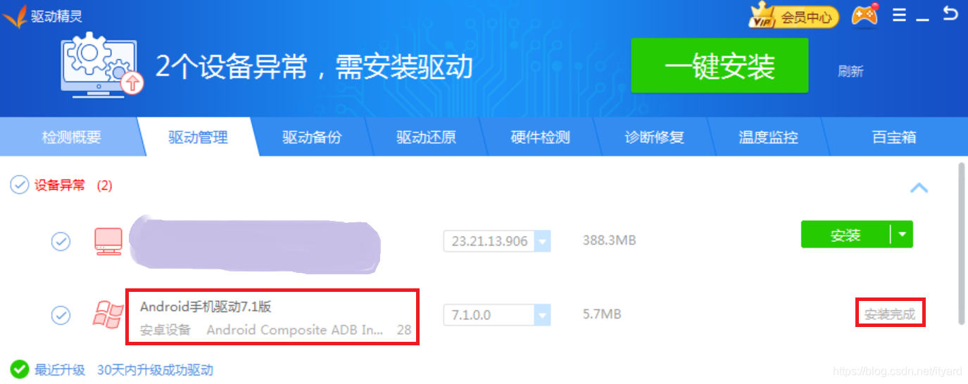 在上面步骤中你可能出现找不到手机的情况,通常这种情况是驱动问题,这里介绍一种简单的处理方式:下载一个驱动精灵,安装启动之后点击驱动管理,之后安装相应驱动即可解决,如图所示: