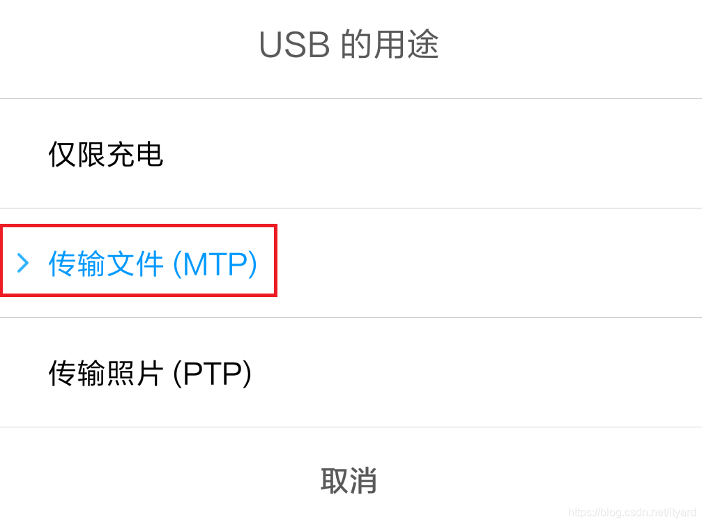 - 此时手机上会弹出USB的用途弹框,我们选择传输文件(MTP)即可,如图所示: