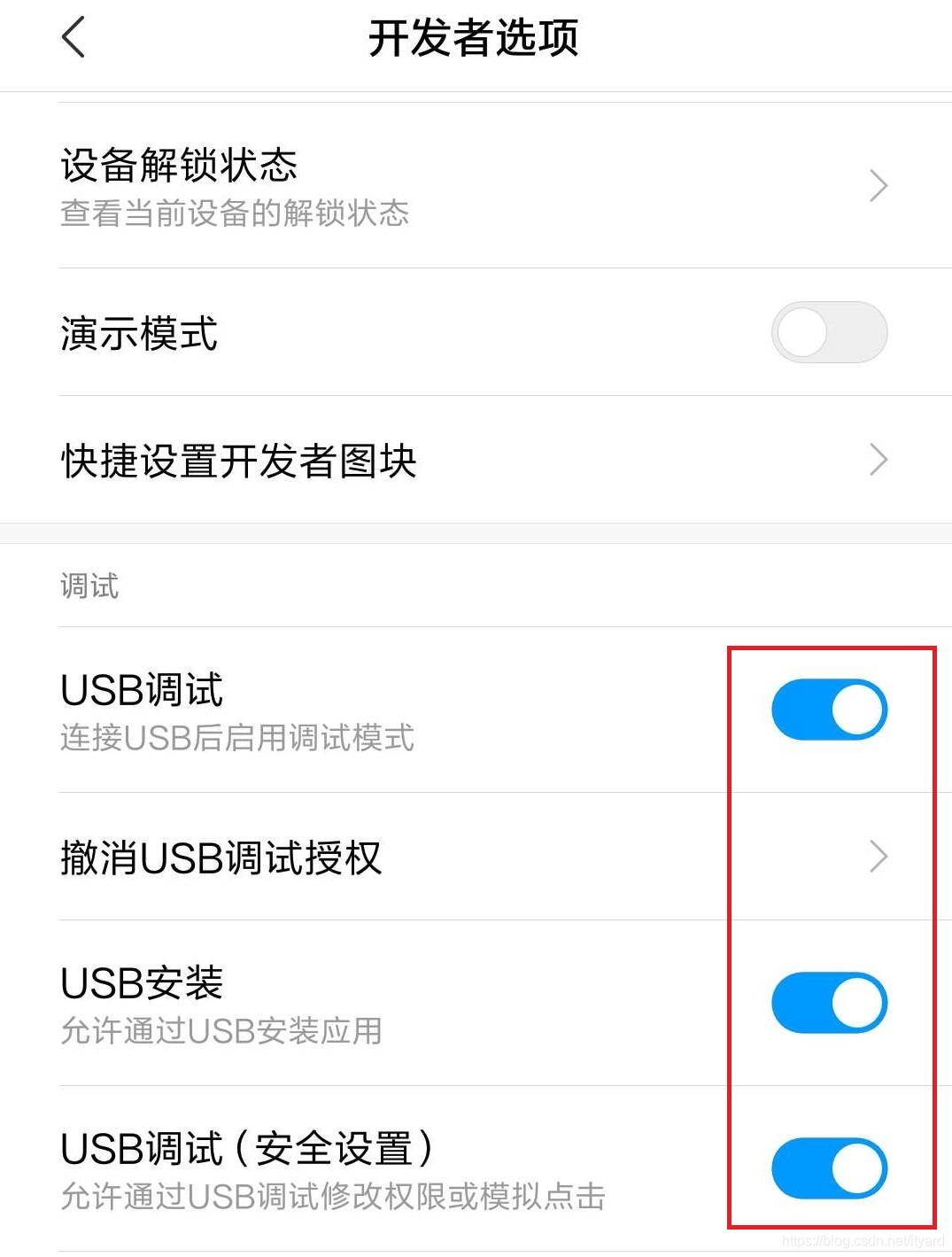 在手机中依次执行(点击):设置->我的设备->全部参数->MIUI版本(多次点击,开启开发者模式)->返回设置列表->更多设置->开发者选项->开启开发者选项并分别开启:USB调试、USB安装、USB调试(安全设置)选项,如图所示:
