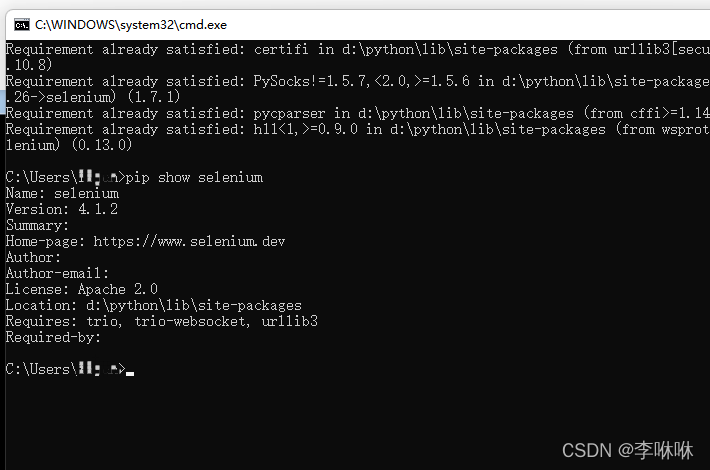 4.安装完成后通过命令 pip show selenium查看安装情况(如下图即安装成功)