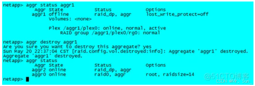查看agg状态,发现只有aggr0,组成的磁盘为v0.16、v0.17、v0.18、v0.19、v0.20、v0.21、v0.22