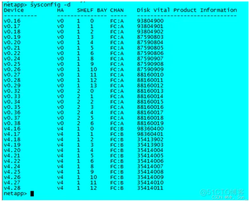 其中,0a.41即为Disk ID(磁盘标识),Disk ID由path_id和deivce_id组成,即path_id.device_id的形式,通过Disk ID可快速定位磁盘的位置。path_id - 指适配卡所在的槽位,和该适配器上的端口号,例如0a表示slot0上的适配器的a口,slot0一般是主板上集成的,slot0上一般有a、b、c、d共4个端口;可在其他slot上附加适配卡,附加的适配卡一般是双端口的(a和b口)device_id - 指磁盘的loop id或者scsi id号,由磁盘柜的类型、磁盘柜的ID号和该磁盘在磁盘柜中的位置(第几个bay)来决定。另外,从sysconfig -r列出的磁盘信息:HA表示path_id;SHELF表示盘柜的编号;BAY表示该磁盘在盘柜中的位置。