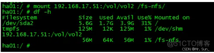 ha01:/ # mount 192.168.17.51:/vol/vol2 /fs-nfs/