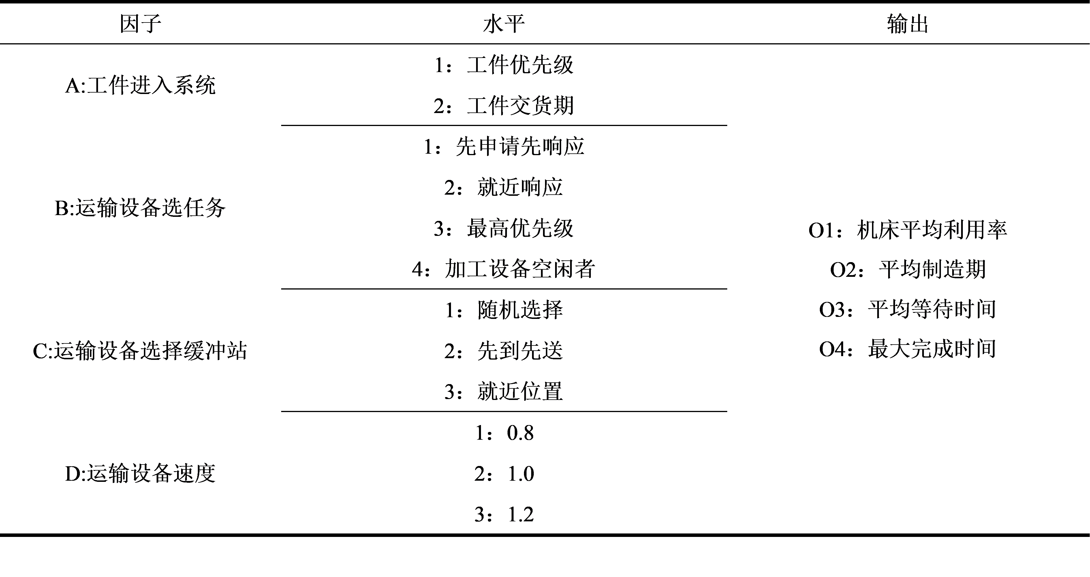 实验中以工件进入系统策略、运输设备选择任务策略、运输设备选择缓冲站策略和运输速度为自变量,分析在不同水平下系统的性能指标,如表4,包括平均机床利用率、平均制造期、平均等待时间和最大完成时间,得到各指标与各因子的响应面方程。