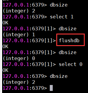 - 例如下面0号数据库中有2个键,1号数据库有1个键,我们使用flushdb只清空1号数据库中的键