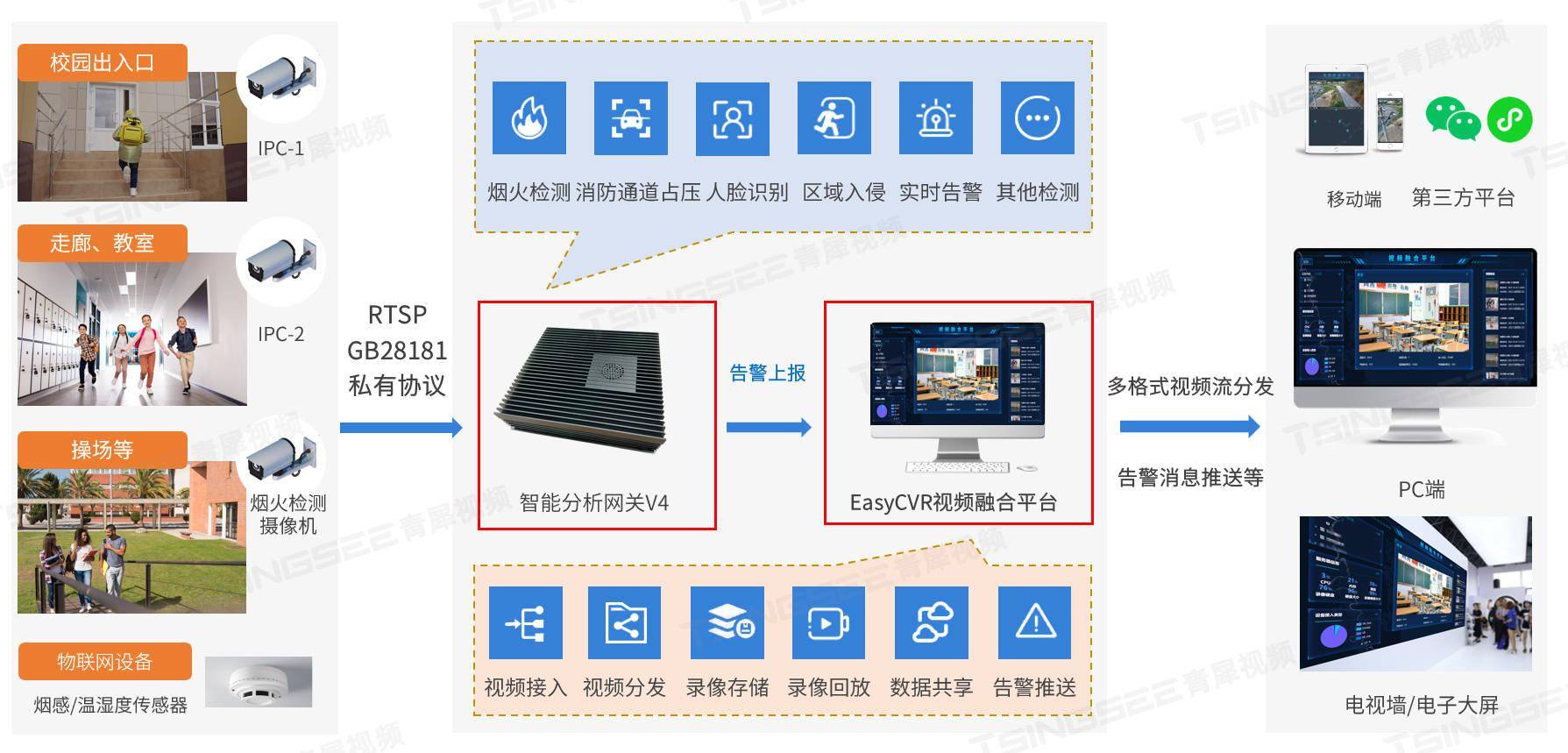 旭帆科技基于当前校园安全需求,采用先进的视频处理分析技术和人工智能技术,结合校园实际情况,设计了一套集视频监控、周界防范监控、危险行为检测、消防安全检测、安全预警系统、智能视频综合管理平台于一体的校园安全视频智能监控方案。