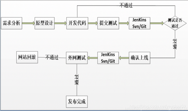 通俗的说就是开发把代码给测试 ,测试确定没问题之后,运维上线,备份之前版本防止出问题后可以通过备份回滚,最后上线测试。