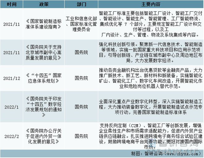 2015年5月,国务院正式印发《中国制造2025》,提出推动新一代信息技术与制造技术融合发展,把智能制造作为两化深度融合的主攻方向;着力发展智能装备和智能产品,推进生产过程智能化,培育新型生产方式,全面提升企业研发、生产、管理和服务的智能化水平,在重点领域试点建设智能工厂/数字化车间。在2022年1月国务院颁布的《国务院关于印发“十四五”数字经济发展规划的通知》中也强调全面深化重点产业数字化转型,深入实施智能制造工程,可见中国智能工厂的核心就是实现制造业智能升级。