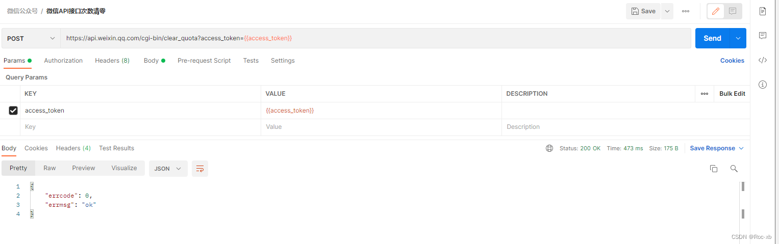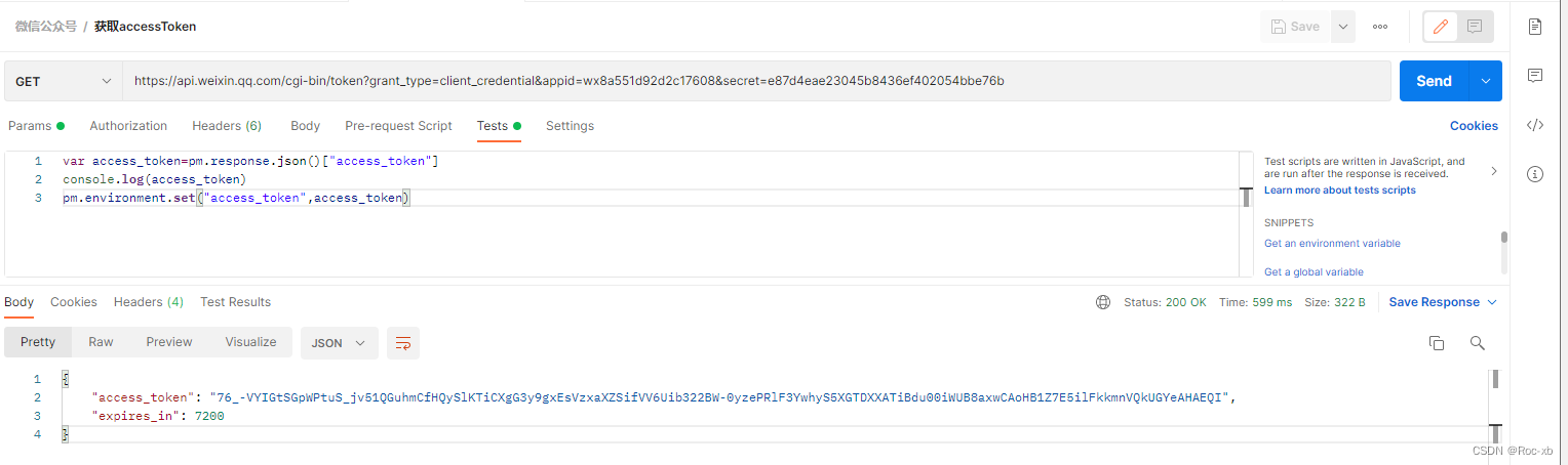 通过调用接口,我们可以看到里面包含access_token参数,这个参数,需要作为另一个接口的请求参数进行调用。我们需要在当前调用即可中的Tests里面编写脚本。