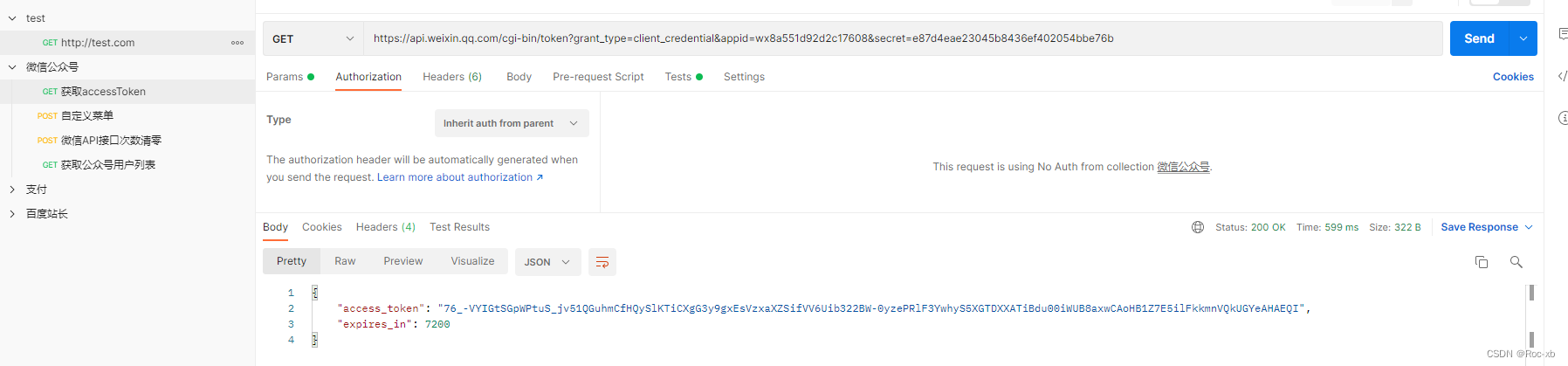 上面,我们已经实现了,在接口请求前的一些操作,那么应该如何实现,将一个接口的返回数据中的某个值,设置为环境变量呢?这里以微信公众号的一个接口作为例子,简单说明。