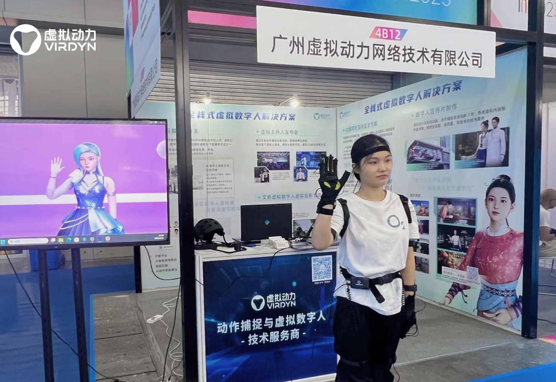 在本次展会上,广州虚拟动力展示了动捕实时互动交互技术,通过动捕演员实时穿戴设备,连接数字人软件,生成虚拟人实时互动画面,让参展者可以沉浸式与数字人互动交流。