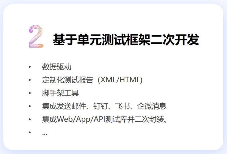 基于单元测试框架二次开发的方向比较多,取决于基于框架设计的定位和目标。以下是常见的扩展功能。