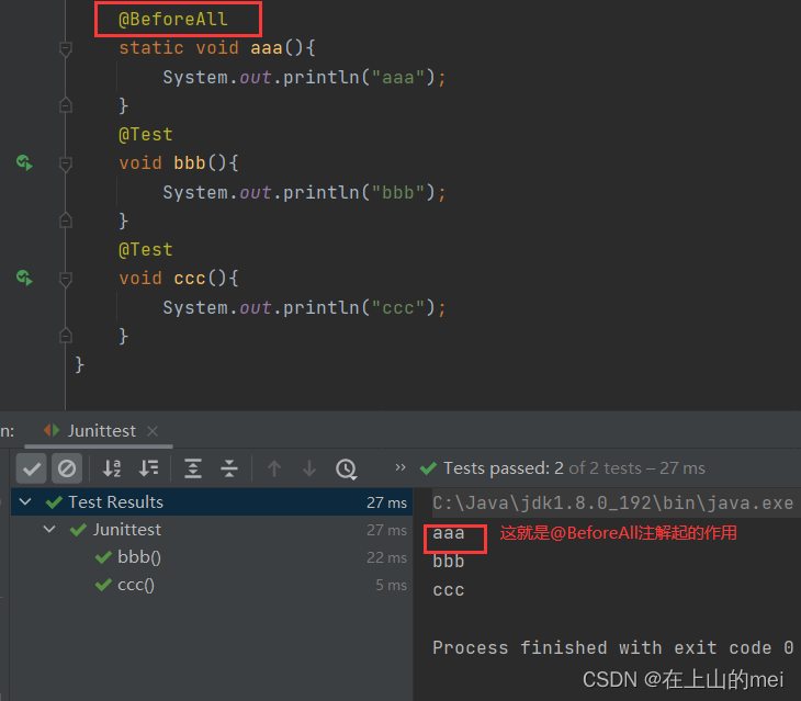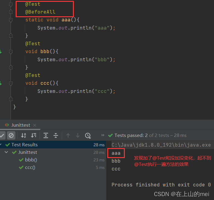 ----答案是:@BeforeEach注解也可以让被注释的方法被执行。但是注意他俩的区别是,@Test注解修饰的方法就是作为方法执行,你在运行结果的左栏(通过打钩,不通过打叉那里)可以看到aaa()方法的执行结果;而@BeforeEach注解的方法更像是让被注解的方法作为一种标记(我愿意这么理解),因此在运行结果的左栏看不见aaa()方法。还有啊还有,既然说到这里了,那我也就都提前说下,除了此处讲的@BeforeEach注解,下面讲的其他注解也都和@BeforeEach注解一样的特点