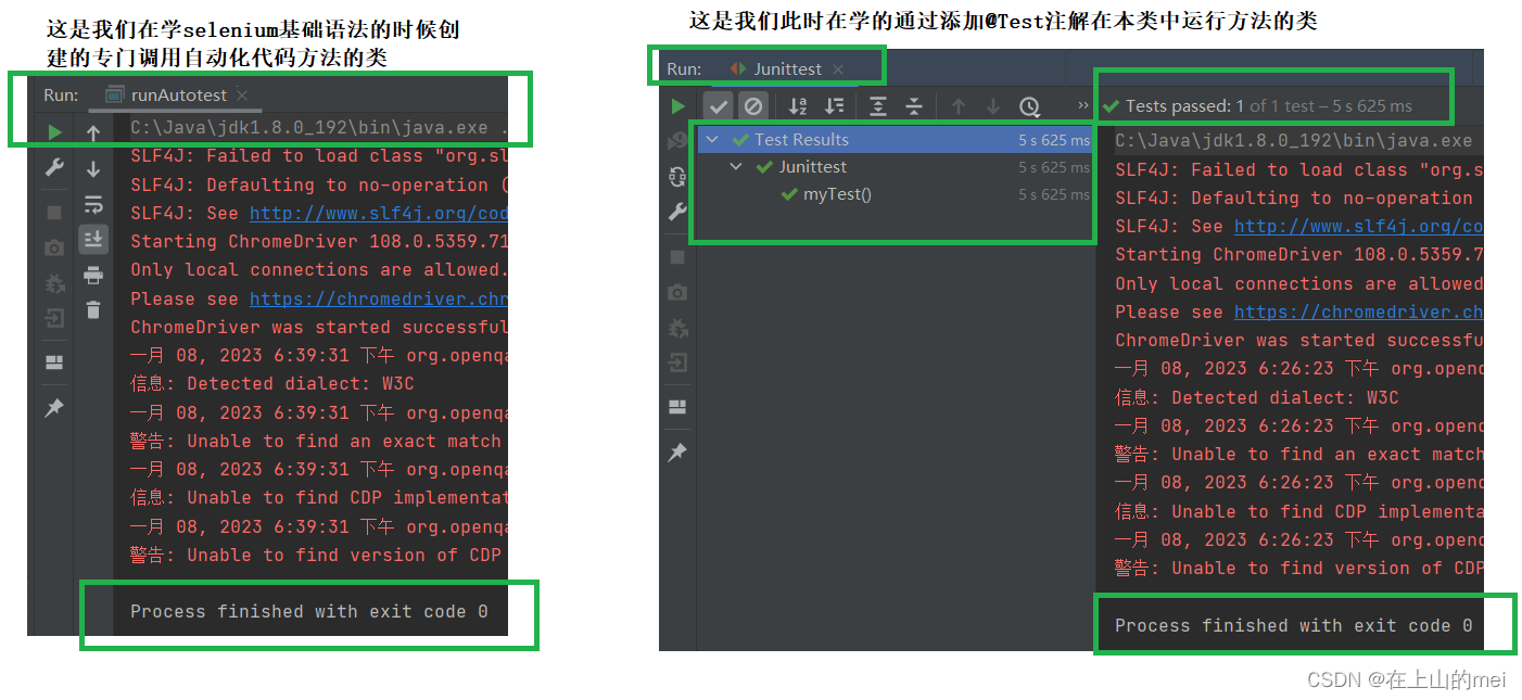 你会发现,我们当前这种方式运行方法的运行结果不但会告诉你是正常退出还是非正常退出,以及如果非正常退出的报错原因(即左图运行结果),还能看到具体是哪个方法报的错,如果通过就会打对勾,没通过就会打叉。这样看来,使用@Test注解的方式更能帮助我们发现问题解决问题。