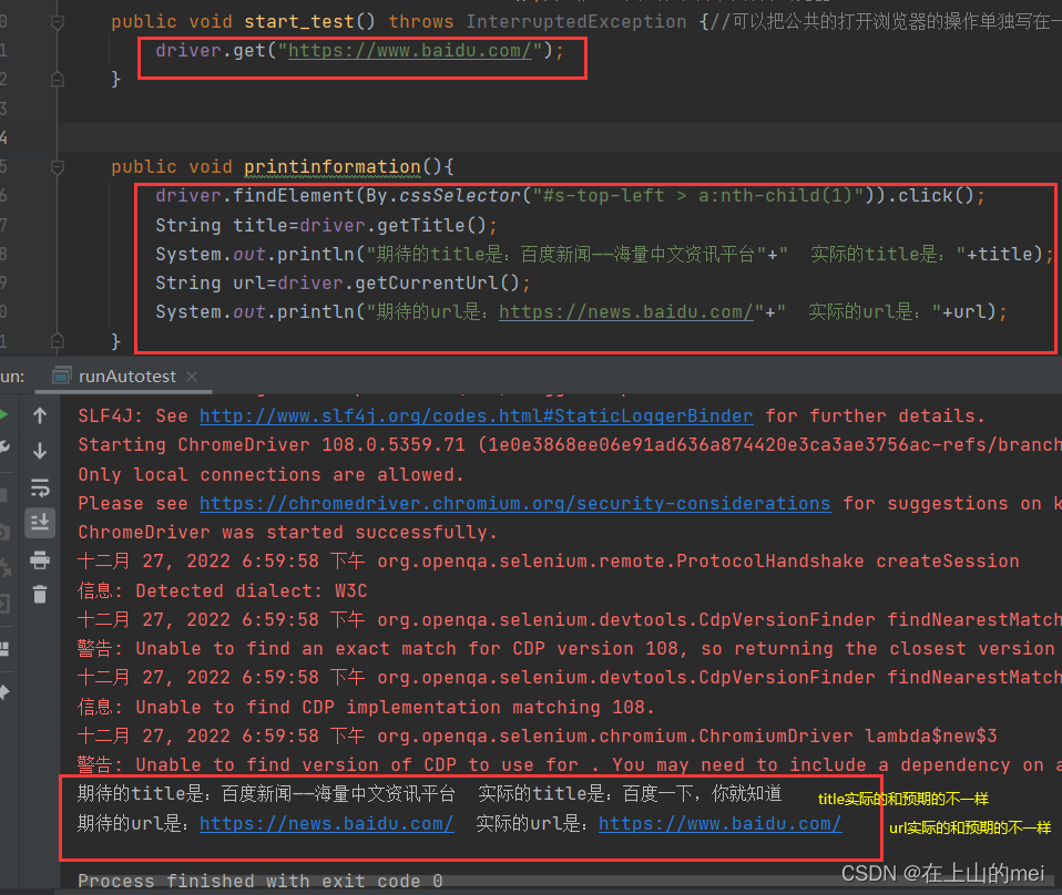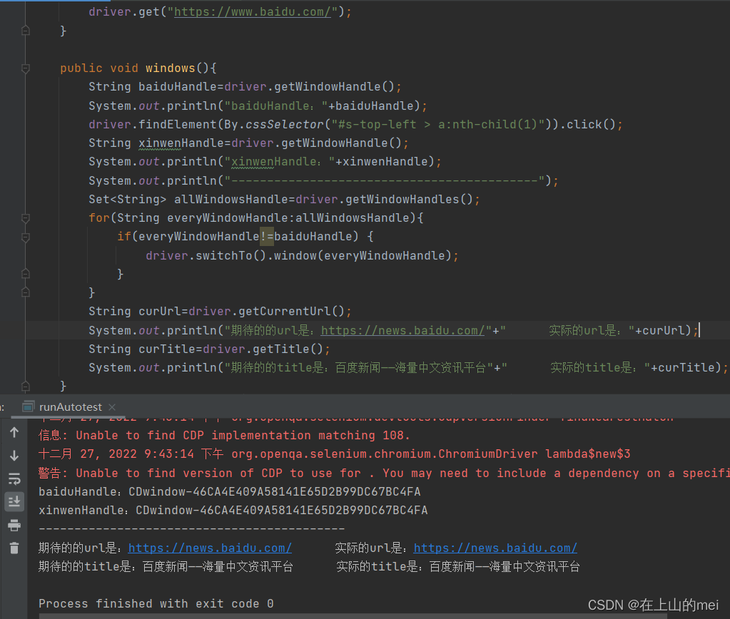 其实问题出在对于selenium来说,他并不知道点击“新闻”链接后应该展示的页面是什么。换句话说,我们手动操作的时候,点击“新闻”超链接,打开了一个新的页面(新闻超链接对应的页面),我们来到这个新页面能够看到他的title和url。但是,selenium不知道。所以即便使用selenium操作的时候,也是成功的打开了新页面的,但是selenium由于没有咱们人的判断力,因此他还是停留在原来的页面,所以这个时候打印title和url自然就还是原来页面的了。
