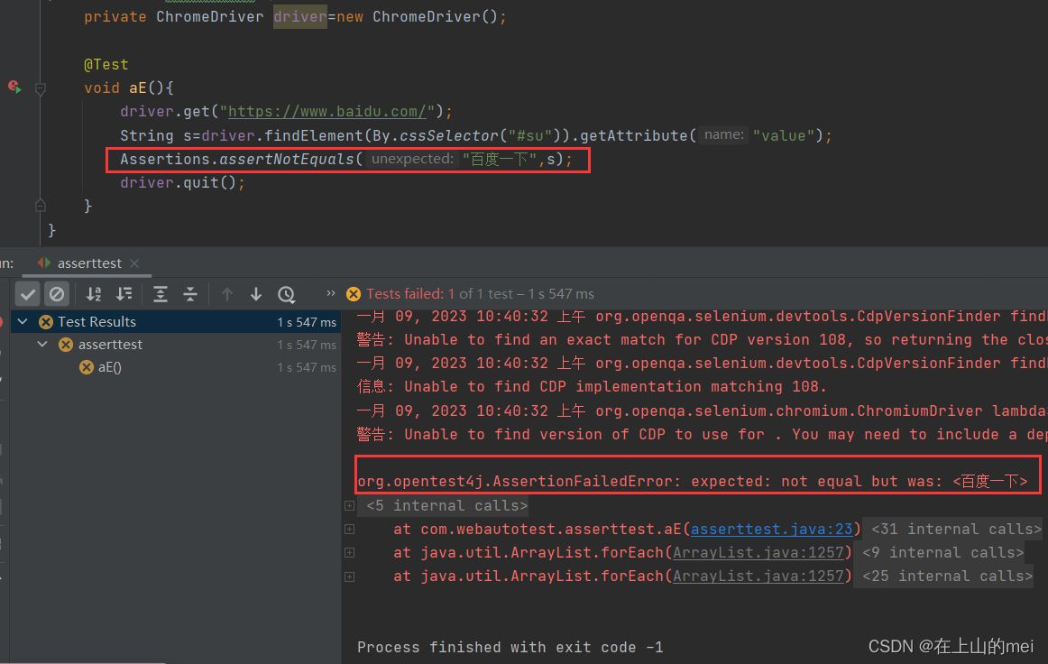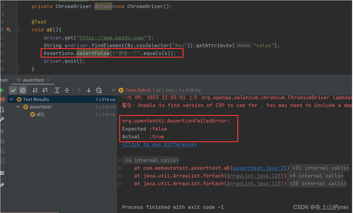 在没使用断言的时候,我们也能够得知测试结果,我们根据看是否是正常退出以及非正常退出时的抛出异常、以及如果使用的是@Test注解执行方法的时候,我们还能在左侧栏得知各个方法的执行结果,通过这些方面得知测试结果出错来源。但是方法中具体哪里出的错,我们不好判断。