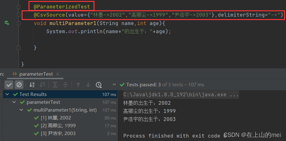 举个例子:@CsvSource(value={"第一对的参数1->第一对的参数2","第二对的参数1->第二对的参数2"},delimiterString="->")
